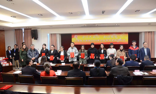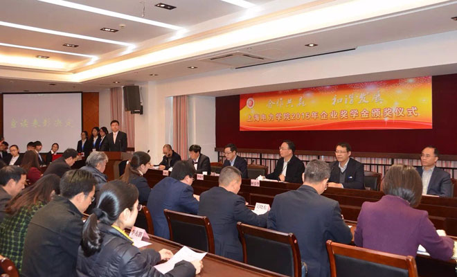 12月16日,上海电力学院教育发展基金会2015年企业奖学金颁奖仪式在杨浦北校区行政中心会议室举行。校长李和兴,校党委副书记、副校长、基金会副理事长顾春华及上海电院电力电子实业有限公司董事长应彭华等奖学金捐赠企业代表应邀莅临颁奖典礼,并为优秀学生颁发奖学金。